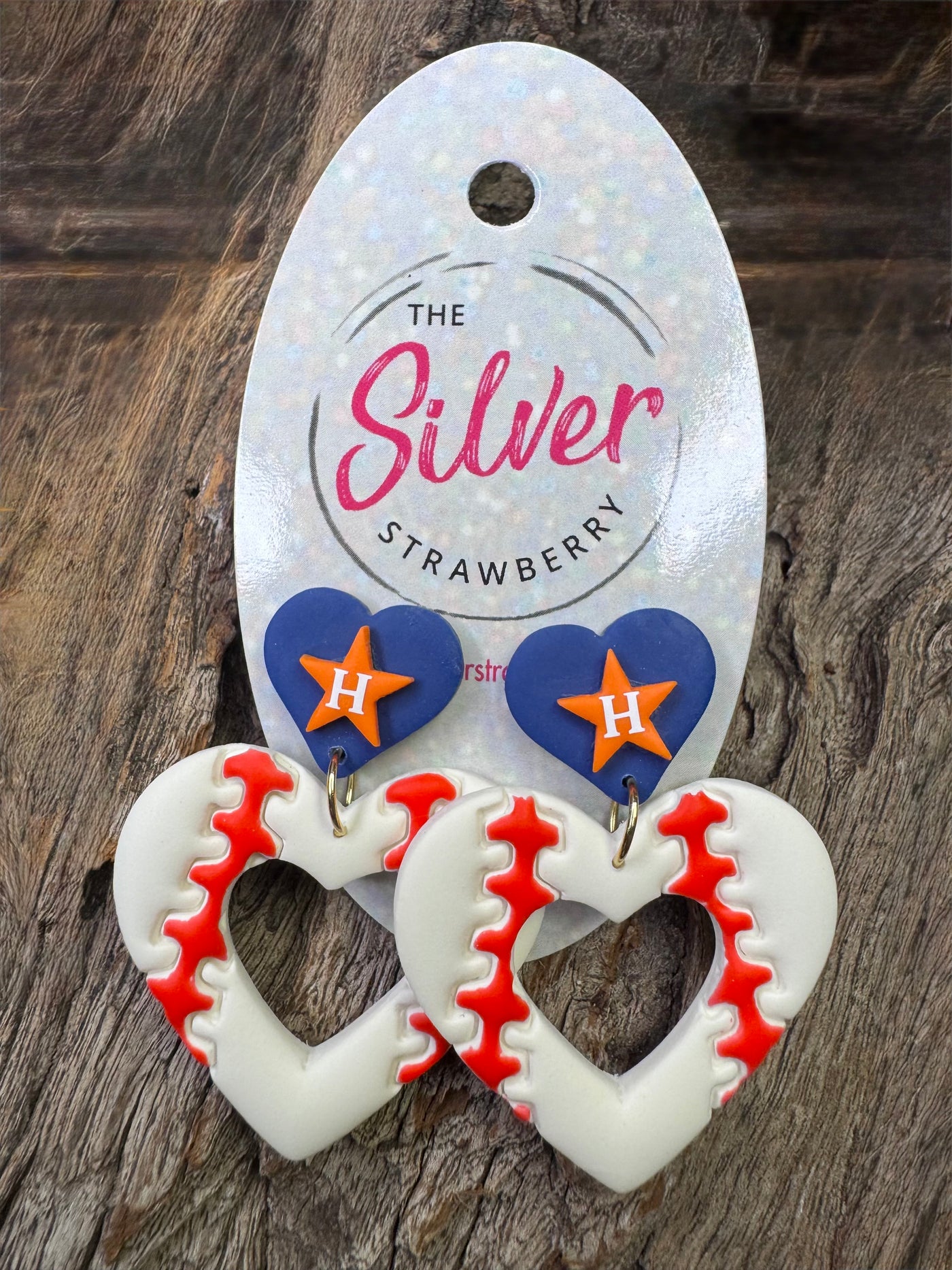 Sway Clay Earrings- "Baseball Stitch Heart; Astros Logo"
