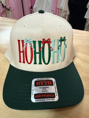 "Ho Ho Ho Green; Bows" Green & Cream Vintage Trucker Hat