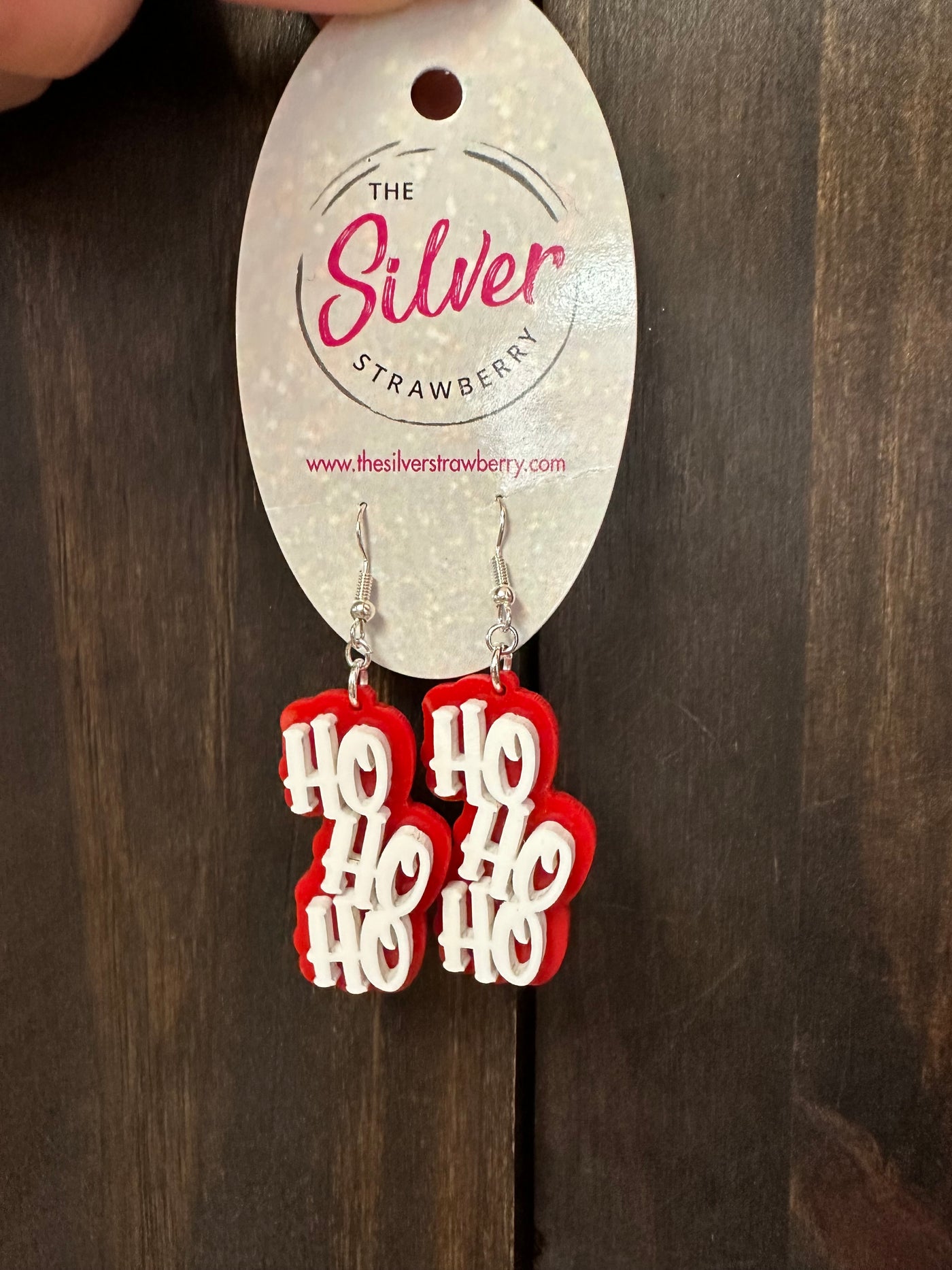 Glossy Acrylic Earrings- "Ho Ho Ho" Red & White Cursive