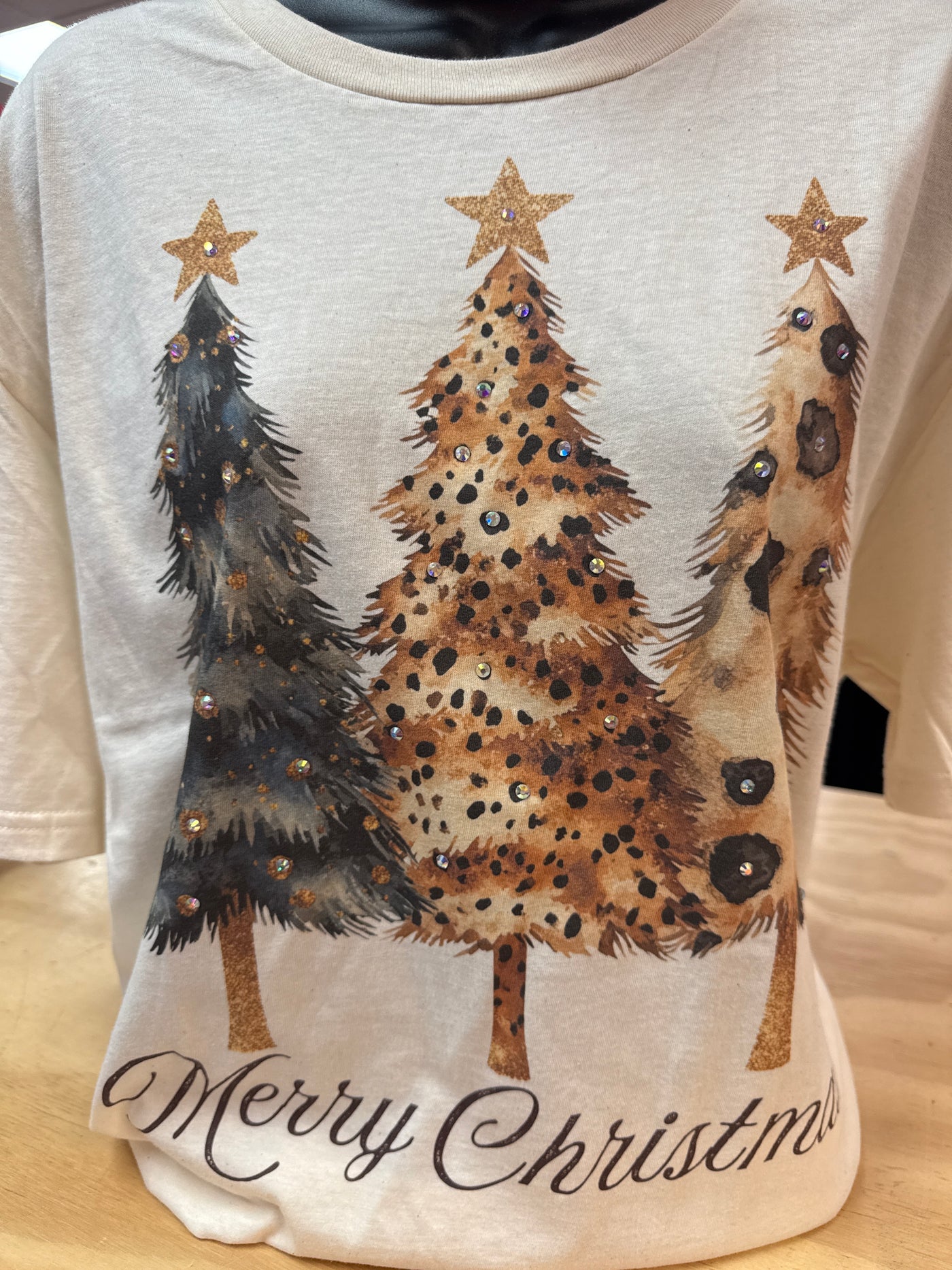 "Leopard Christmas Trees" Rhinestone Cream Tee