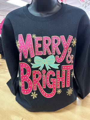 "Merry & Bright; Bow" Black Rhinestone Sweatshirt Top