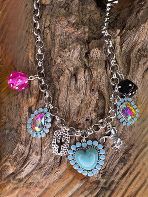 Unleash your inner rebel with the Dakota Necklace! This charming piece features dice, cactus, and silver charms alongside turquoise accents, adding a touch of western flair to any outfit. Stand out from the crowd and make a statement with the "Turquoise Rebel" Charm Necklace!