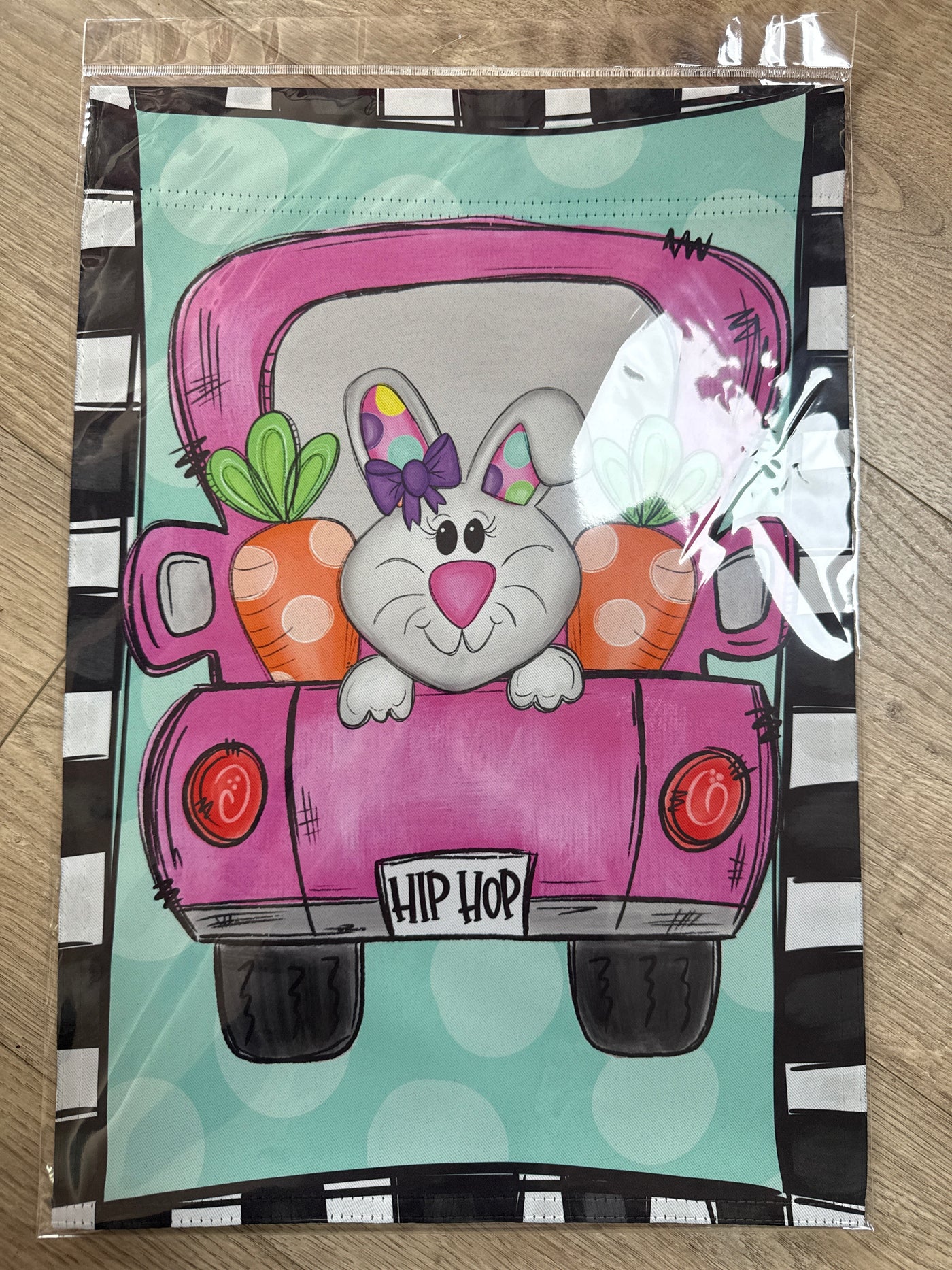 Garden Flag (Double Sided)- "Easter Bunny In Truck" Pink