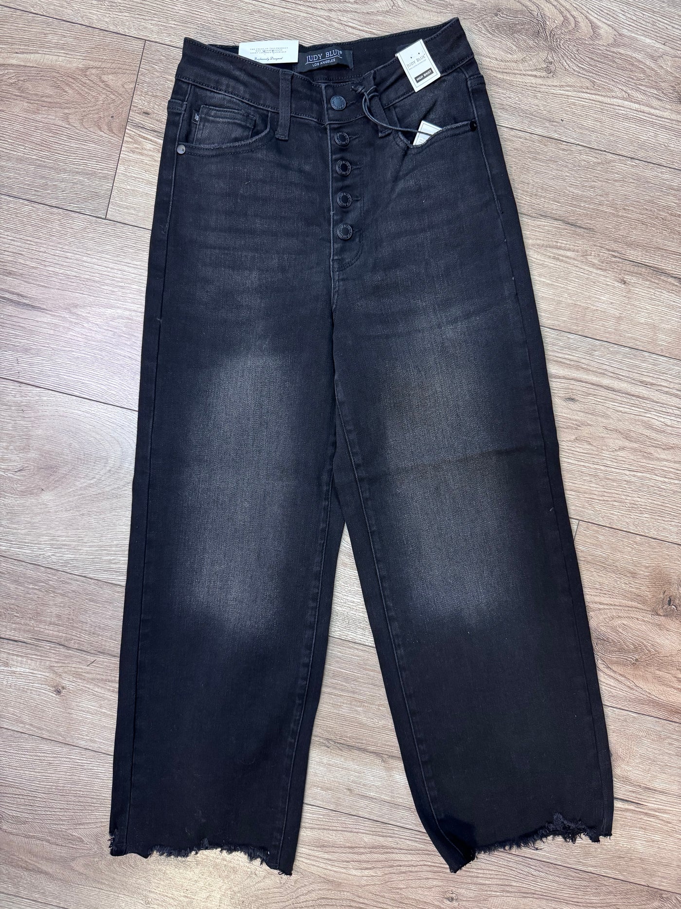 Judy Blue High Waisted Jeans- Black Crop Wide; Destroyed Raw Hem (29R)