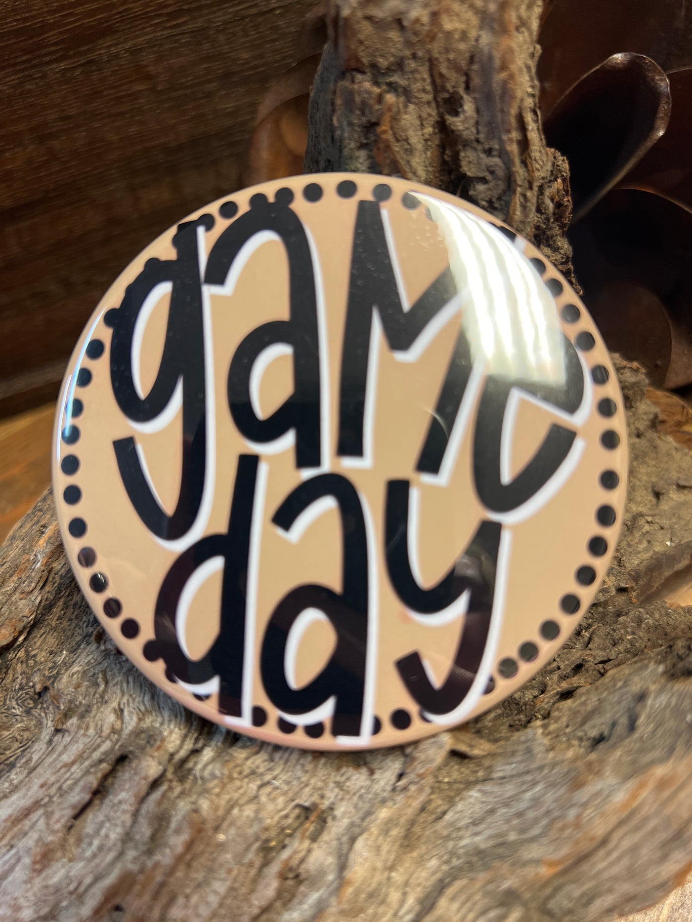 Button Pins- "Gameday" Gold & Black Polka Dots; Gold Background
