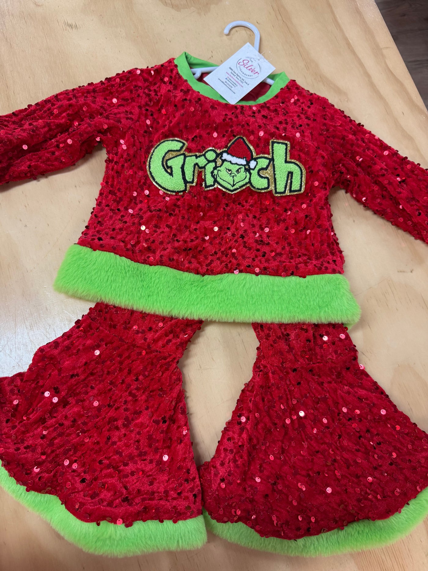 "Grinch Red Sequins" Green Edging Top & Pant Set