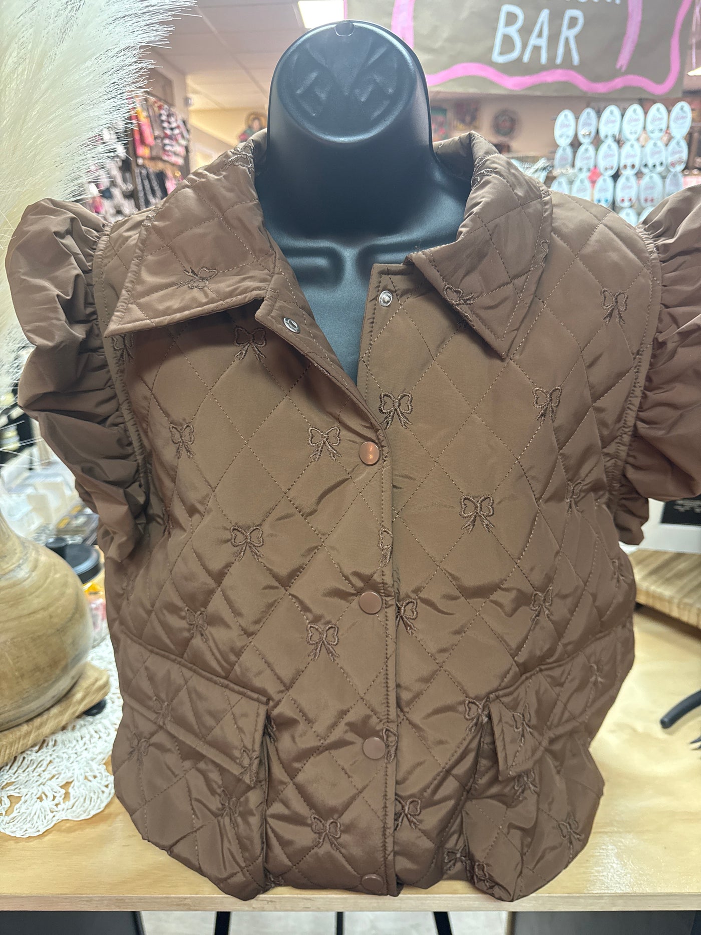 "Brown Embroidered Bows" Puffer Vest Top