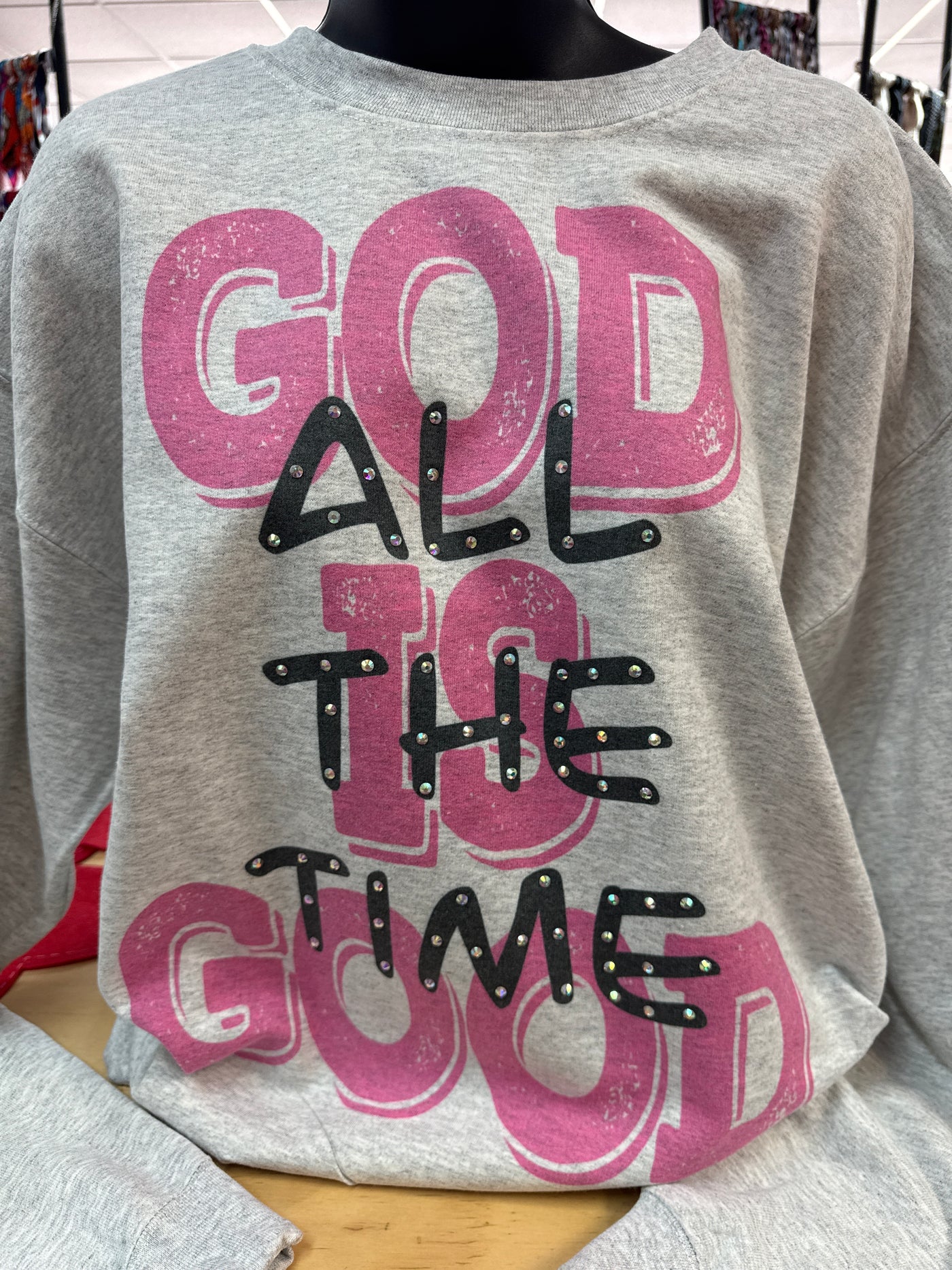 {"id":9145468944620,"title":"\"God Is Good All The Time; Rhinestone\" Gray Sweatshirt","handle":"god-is-good-all-the-time-rhinestone-gray-sweatshirt","description":"","published_at":"2026-01-27T13:01:46-06:00","created_at":"2026-01-27T13:01:46-06:00","vendor":"The Silver Strawberry","type":"Women's Tops","tags":[],"price":5995,"price_min":5995,"price_max":5995,"available":true,"price_varies":false,"compare_at_price":0,"compare_at_price_min":0,"compare_at_price_max":0,"compare_at_price_varies":false,"variants":[{"id":47256281415916,"title":"Small","option1":"Small","option2":null,"option3":null,"sku":null,"requires_shipping":true,"taxable":true,"featured_image":null,"available":false,"name":"\"God Is Good All The Time; Rhinestone\" Gray Sweatshirt - Small","public_title":"Small","options":["Small"],"price":5995,"weight":0,"compare_at_price":0,"inventory_management":"shopify","barcode":"81415916","requires_selling_plan":false,"selling_plan_allocations":[]},{"id":47256281448684,"title":"Medium","option1":"Medium","option2":null,"option3":null,"sku":null,"requires_shipping":true,"taxable":true,"featured_image":null,"available":true,"name":"\"God Is Good All The Time; Rhinestone\" Gray Sweatshirt - Medium","public_title":"Medium","options":["Medium"],"price":5995,"weight":0,"compare_at_price":0,"inventory_management":"shopify","barcode":"81448684","requires_selling_plan":false,"selling_plan_allocations":[]},{"id":47256281481452,"title":"Large","option1":"Large","option2":null,"option3":null,"sku":null,"requires_shipping":true,"taxable":true,"featured_image":null,"available":true,"name":"\"God Is Good All The Time; Rhinestone\" Gray Sweatshirt - Large","public_title":"Large","options":["Large"],"price":5995,"weight":0,"compare_at_price":0,"inventory_management":"shopify","barcode":"81481452","requires_selling_plan":false,"selling_plan_allocations":[]},{"id":47256281514220,"title":"X-Large","option1":"X-Large","option2":null,"option3":null,"sku":null,"requires_shipping":true,"taxable":true,"featured_image":null,"available":true,"name":"\"God Is Good All The Time; Rhinestone\" Gray Sweatshirt - X-Large","public_title":"X-Large","options":["X-Large"],"price":5995,"weight":0,"compare_at_price":0,"inventory_management":"shopify","barcode":"81514220","requires_selling_plan":false,"selling_plan_allocations":[]},{"id":47256281546988,"title":"2X-Large","option1":"2X-Large","option2":null,"option3":null,"sku":null,"requires_shipping":true,"taxable":true,"featured_image":null,"available":false,"name":"\"God Is Good All The Time; Rhinestone\" Gray Sweatshirt - 2X-Large","public_title":"2X-Large","options":["2X-Large"],"price":5995,"weight":0,"compare_at_price":0,"inventory_management":"shopify","barcode":"81546988","requires_selling_plan":false,"selling_plan_allocations":[]},{"id":47256281579756,"title":"3X-Large","option1":"3X-Large","option2":null,"option3":null,"sku":null,"requires_shipping":true,"taxable":true,"featured_image":null,"available":false,"name":"\"God Is Good All The Time; Rhinestone\" Gray Sweatshirt - 3X-Large","public_title":"3X-Large","options":["3X-Large"],"price":5995,"weight":0,"compare_at_price":0,"inventory_management":"shopify","barcode":"81579756","requires_selling_plan":false,"selling_plan_allocations":[]}],"images":["\/\/thesilverstrawberry.com\/cdn\/shop\/files\/D78753EF-6359-428E-932F-959B01F7128F.jpg?v=1769628620"],"featured_image":"\/\/thesilverstrawberry.com\/cdn\/shop\/files\/D78753EF-6359-428E-932F-959B01F7128F.jpg?v=1769628620","options":["Size"],"media":[{"alt":null,"id":36629724922092,"position":1,"preview_image":{"aspect_ratio":0.75,"height":4032,"width":3024,"src":"\/\/thesilverstrawberry.com\/cdn\/shop\/files\/D78753EF-6359-428E-932F-959B01F7128F.jpg?v=1769628620"},"aspect_ratio":0.75,"height":4032,"media_type":"image","src":"\/\/thesilverstrawberry.com\/cdn\/shop\/files\/D78753EF-6359-428E-932F-959B01F7128F.jpg?v=1769628620","width":3024}],"requires_selling_plan":false,"selling_plan_groups":[],"content":""}