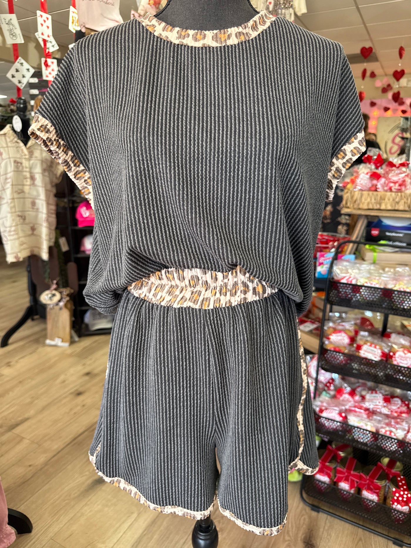 Cheetah Hem Charcoal "Ribbed; Short Sleeve" 2-Piece Short Set