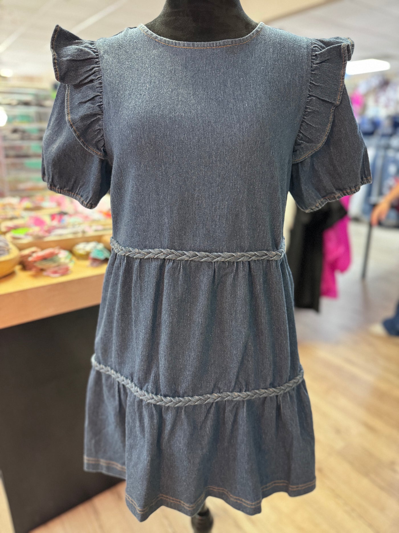 "Denim Braid Trim Detail" Tiered Mini Dress